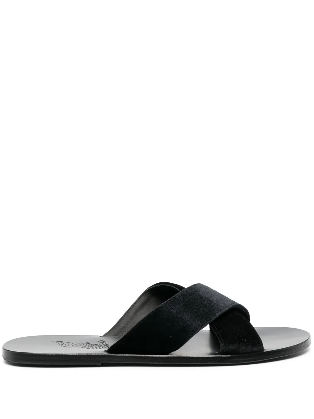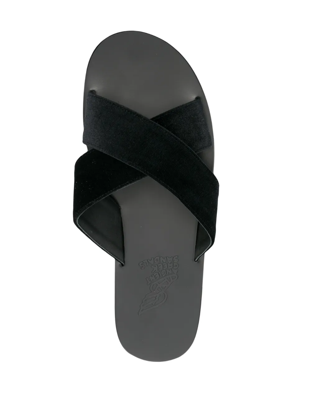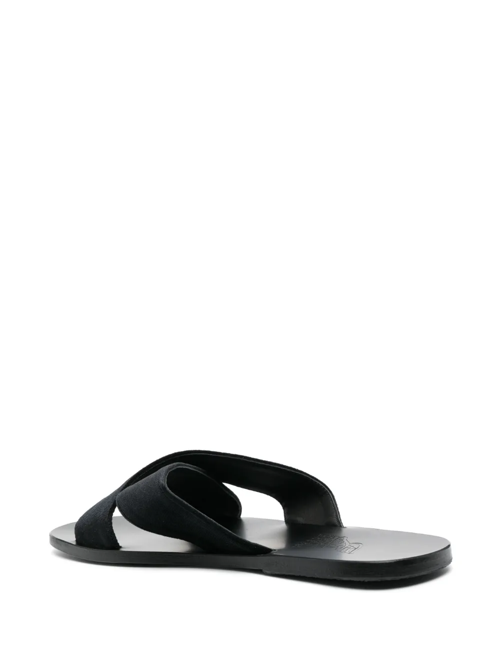 Kritonas leather slides from ANCIENT GREEK SANDALS featuring black, calf leather, crossover strap at the toe, branded leather insole, slip-on style and flat leather sole.