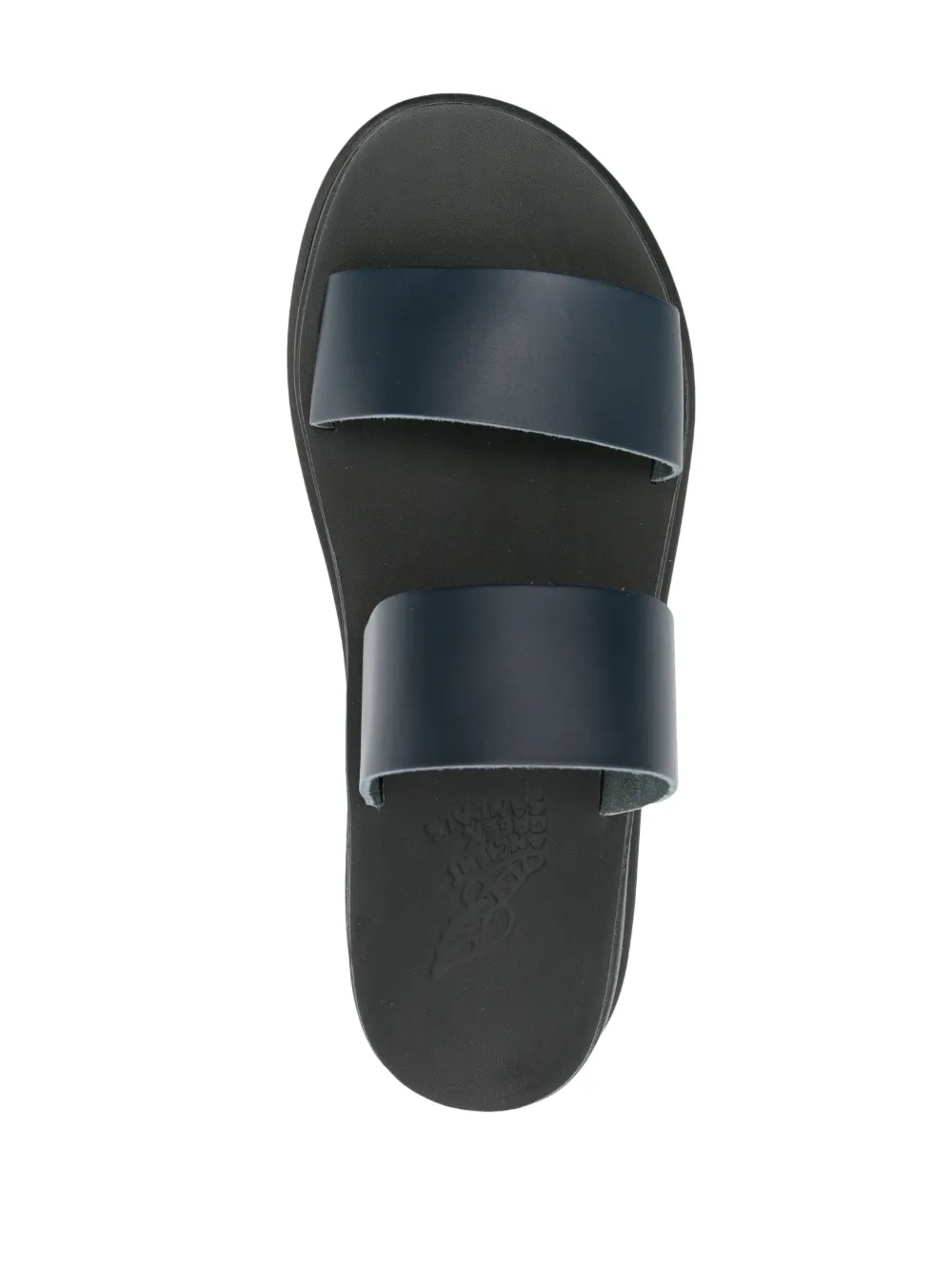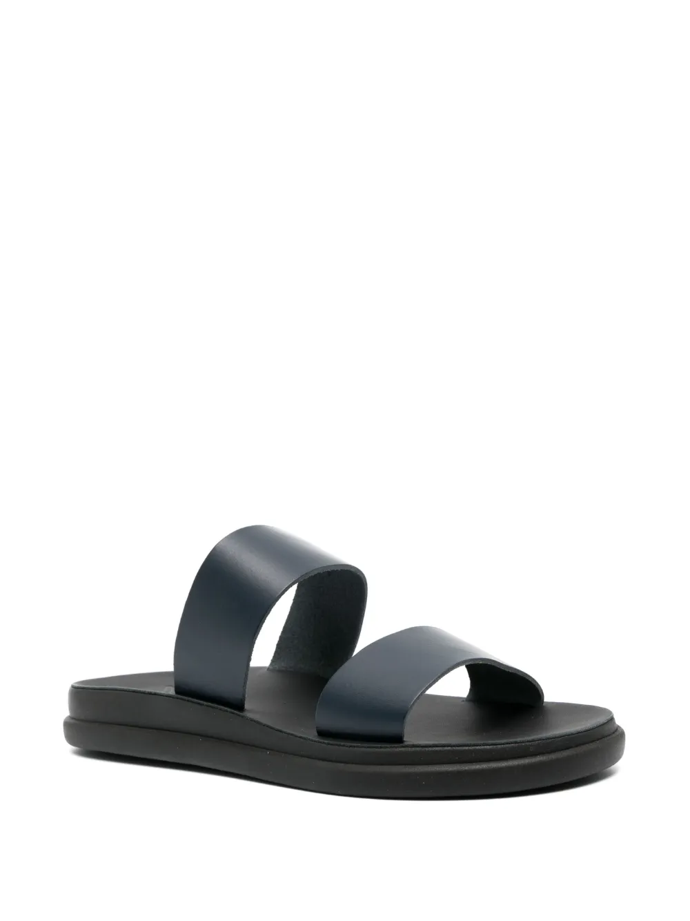 Nicos leather slides from ANCIENT GREEK SANDALS featuring navy blue, calf leather, double-strap design, branded leather insole, slip-on style and flat rubber sole.