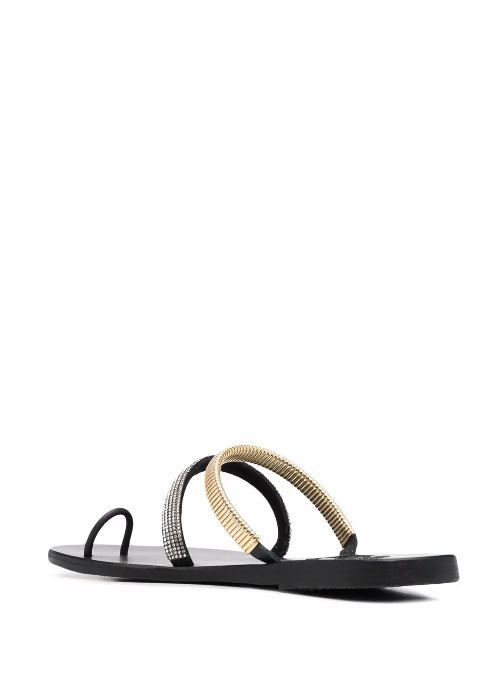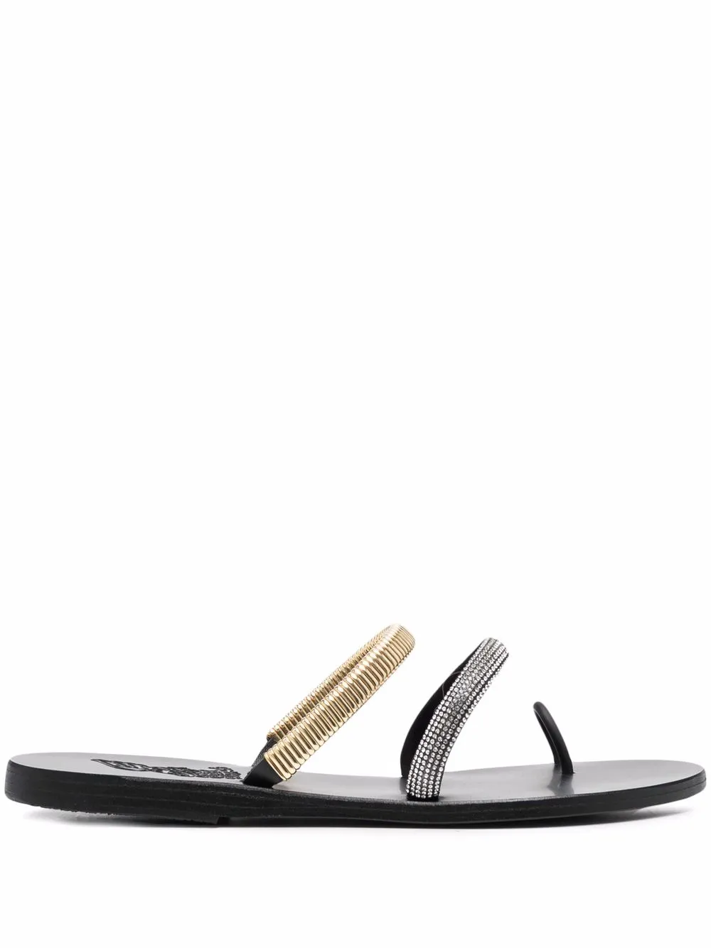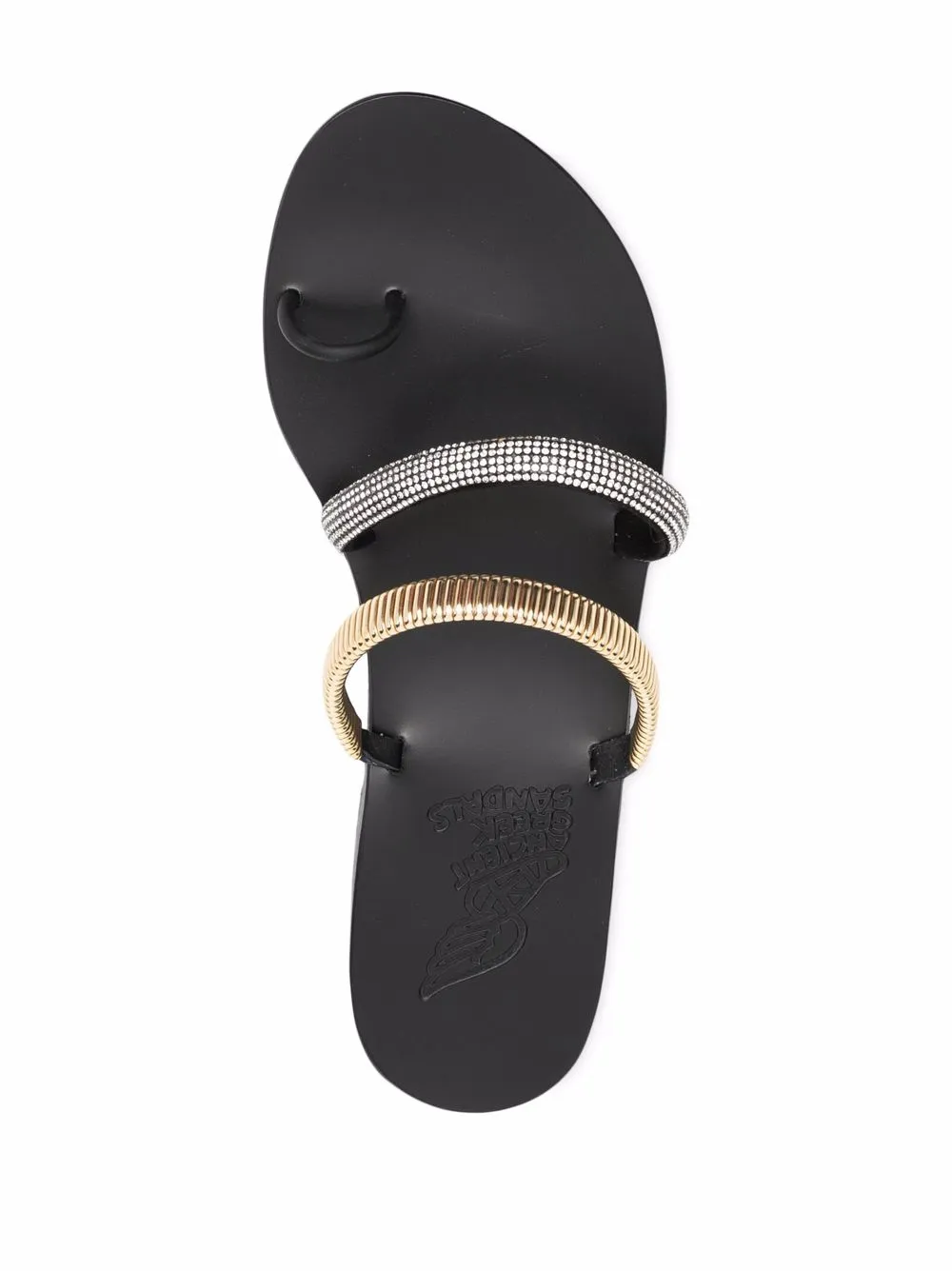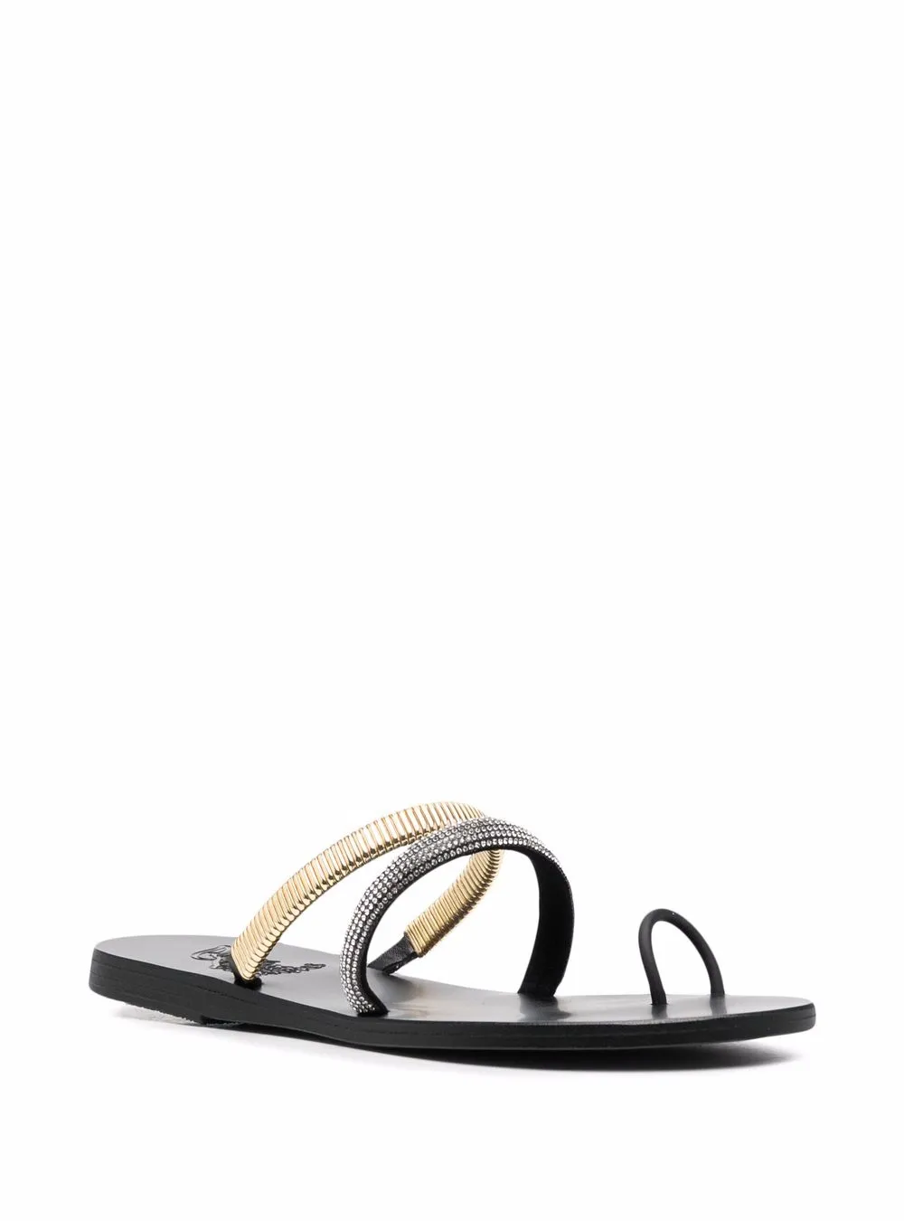 Black/gold/silver leather Amythiti leather sandals from ANCIENT GREEK SANDALS featuring crystal embellishment, gold-tone hardware, round toe, branded insole, flat rubber sole and strappy design. POSITIVELY CONSCIOUS: We’ve partnered with Good On You — an ethical agency that rates how sustainably brands perform across various people, planet and animal welfare criteria. This product comes from a Conscious brand that performs well in relation to their impact on people, which ensures good working conditions in the supply chain..