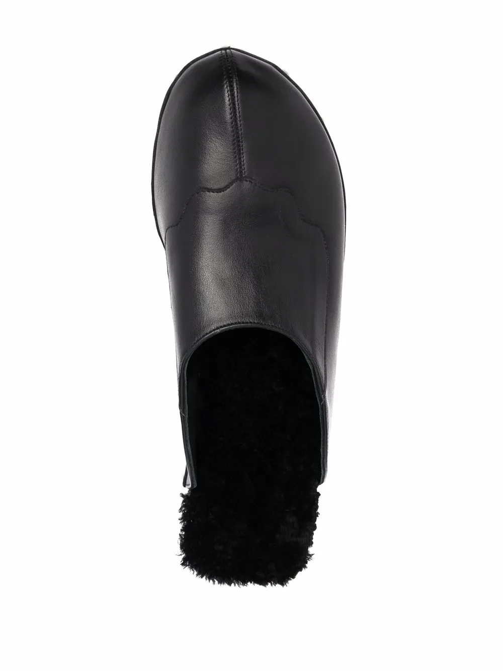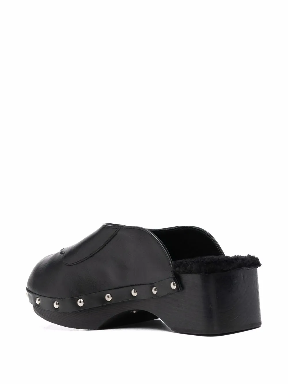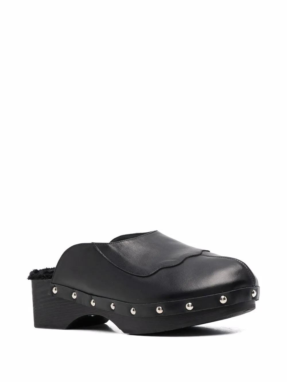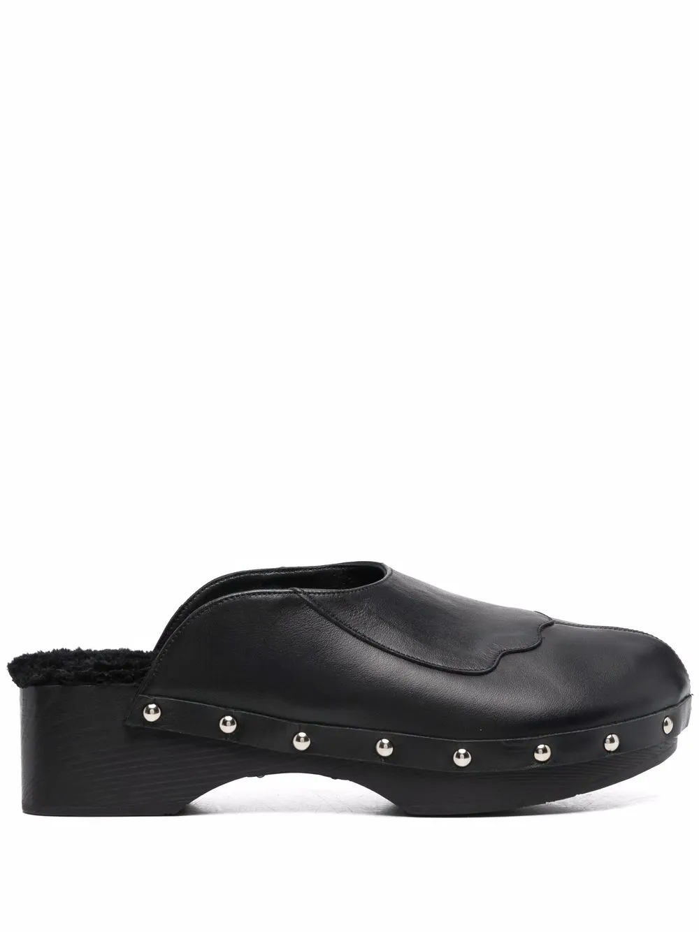 Black leather/shearling closed leather clogs from ANCIENT GREEK SANDALS featuring silver-tone stud detailing, round toe, branded insole, shearling lining, branded insole, wooden sole and slip-on style. POSITIVELY CONSCIOUS: We’ve partnered with Good On You — an ethical agency that rates how sustainably brands perform across various people, planet and animal welfare criteria. This product comes from a Conscious brand that performs well in relation to their impact on people, which ensures good working conditions in the supply chain..