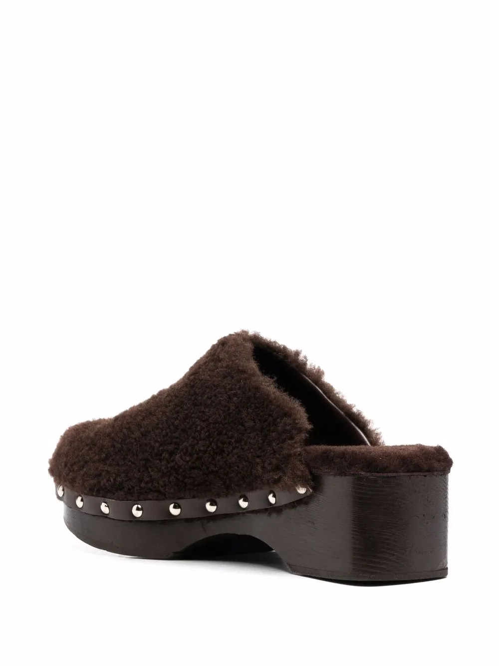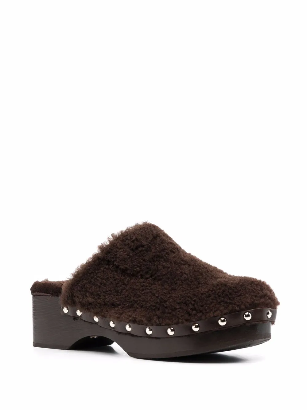 Dark brown leather closed sheepskin clogs from ANCIENT GREEK SANDALS featuring stud detailing, round toe, branded insole and low block heel. POSITIVELY CONSCIOUS: We’ve partnered with Good On You — an ethical agency that rates how sustainably brands perform across various people, planet and animal welfare criteria. This product comes from a Conscious brand that performs well in relation to their impact on people, which ensures good working conditions in the supply chain..