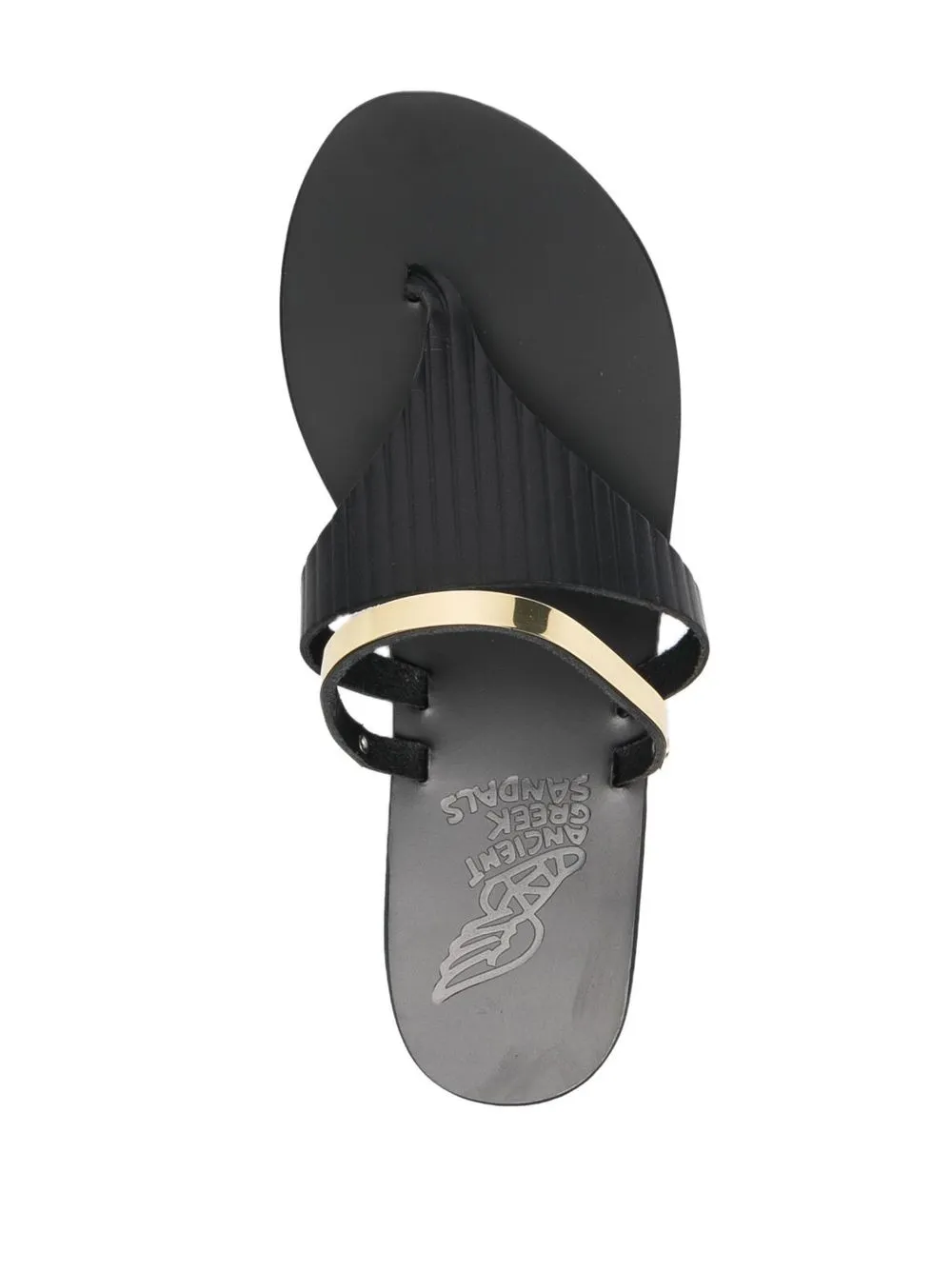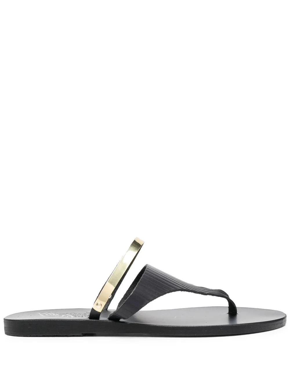 Drepani leather sandals from ANCIENT GREEK SANDALS featuring black, leather, strap detailing, gold-tone hardware, open toe, thong strap, branded leather insole, flat leather sole and slip-on style.