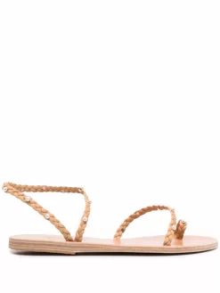 Natural beige leather Eleftheria pearl leather sandals from ANCIENT GREEK SANDALS featuring faux-pearl detailing, round toe, branded insole, flat rubber sole and braided strap design. POSITIVELY CONSCIOUS: We’ve partnered with Good On You — an ethical agency that rates how sustainably brands perform across various people, planet and animal welfare criteria. This product comes from a Conscious brand that performs well in relation to their impact on people, which ensures good working conditions in the supply chain..