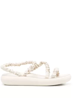 Eleftheria ruched open-toe sandals from ANCIENT GREEK SANDALS featuring off-white, ruched detailing, open toe, branded insole and flat rubber sole. POSITIVELY CONSCIOUS: We’ve partnered with Good On You — an ethical agency that rates how sustainably brands perform across various people, planet and animal welfare criteria. This product comes from a Conscious brand that performs well in relation to their impact on people, which ensures good working conditions in the supply chain..