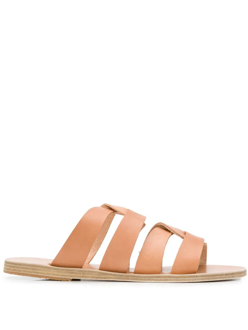 Natural beige bos taurus and leather Enosi sandals from Ancient Greek Sandals featuring an open toe, a strappy design, a branded insole and a flat sole. POSITIVELY CONSCIOUS: Ancient Greek Sandals scores 3 out 5 by independent ethical brand rating agency Good On You. It manufactures locally to reduce its carbon footprint, uses low impact non-toxic dyes and visits suppliers regularly in its supply chain.