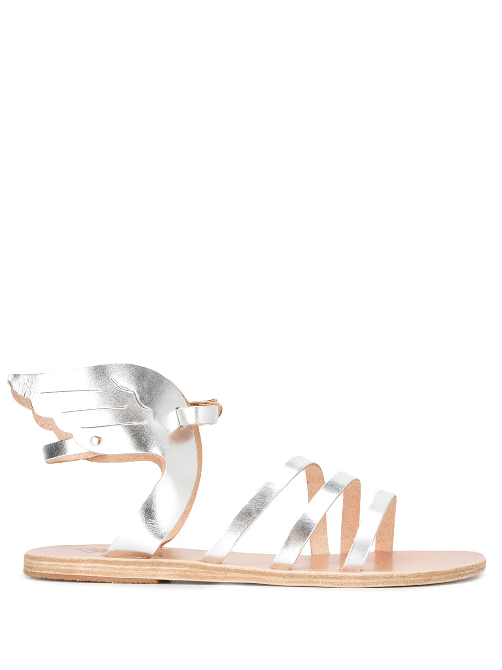 Silver toned leather gladiator sandals from Ancient Greek Sandals. POSITIVELY CONSCIOUS: Ancient Greek Sandals scores 3 out 5 by independent ethical brand rating agency Good On You. It manufactures locally to reduce its carbon footprint, uses low impact non-toxic dyes and visits suppliers regularly in its supply chain.