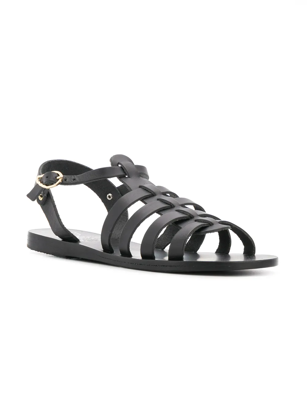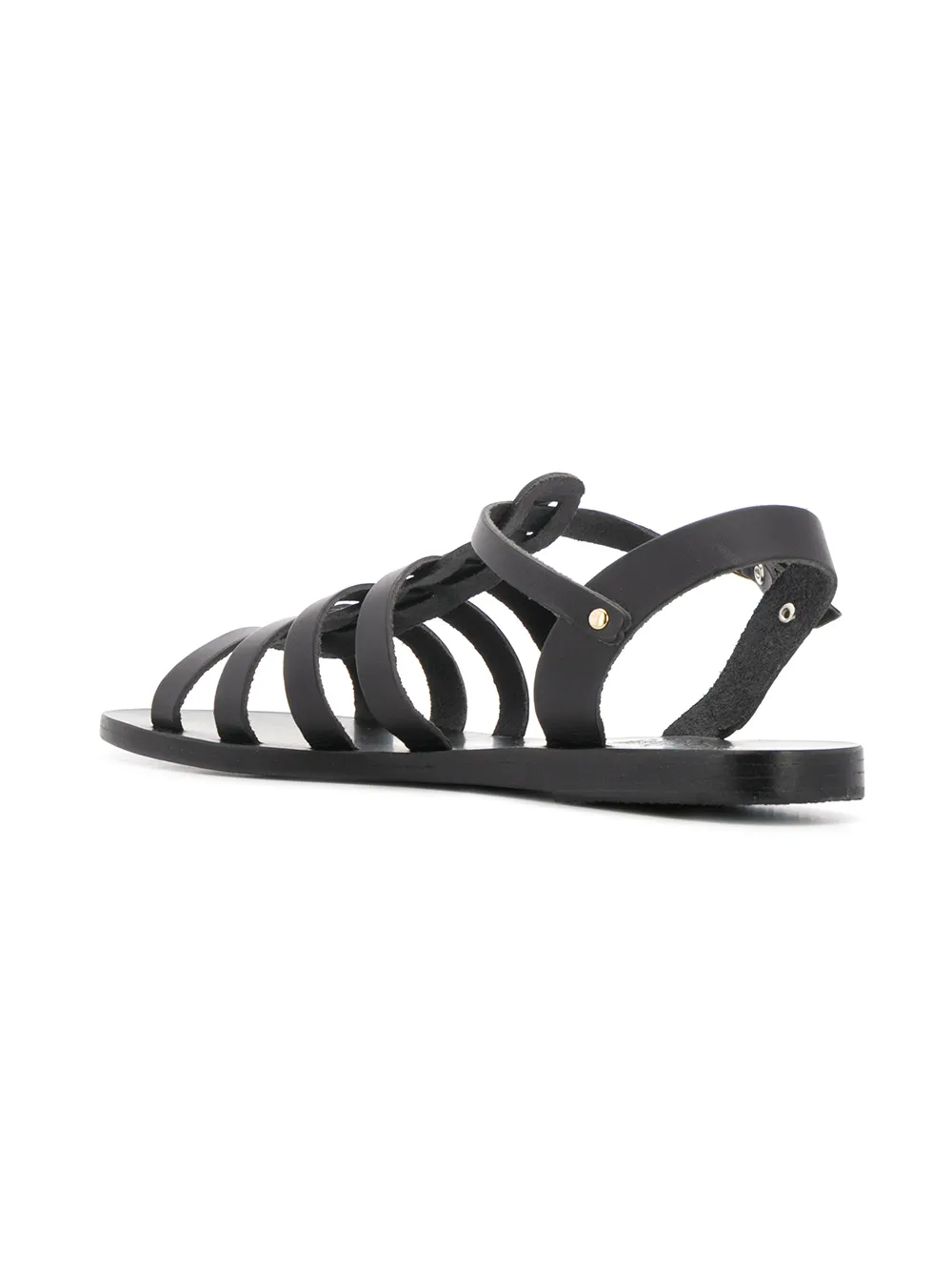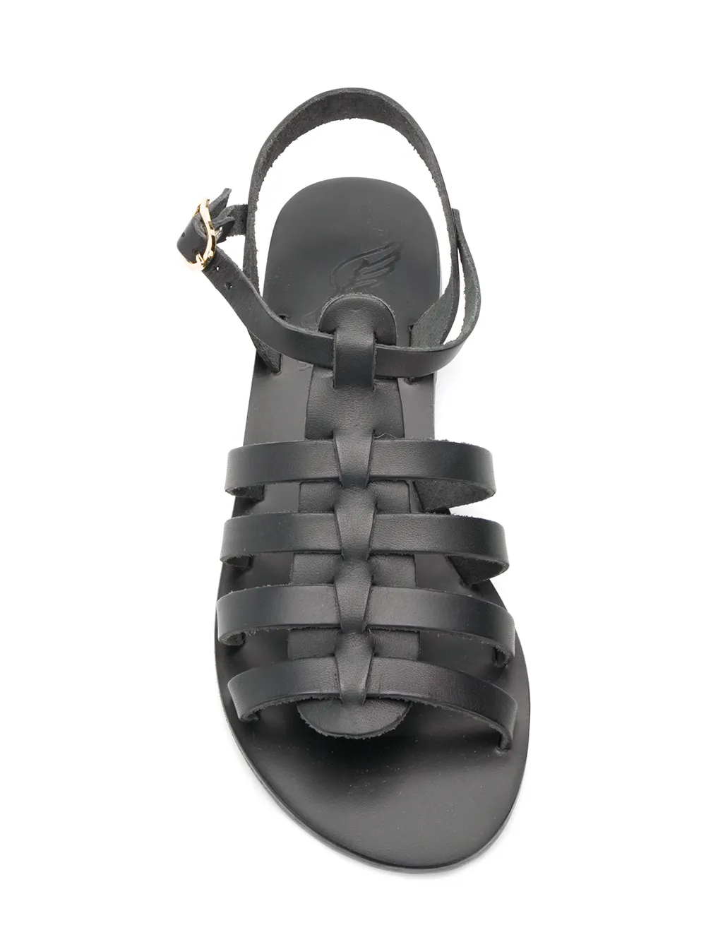 Black leather Korinna sandals from Ancient Greek Sandals featuring an open toe, a strappy design, a side buckle fastening, a branded insole and a flat rubber sole. POSITIVELY CONSCIOUS: Ancient Greek Sandals scores 3 out 5 by independent ethical brand rating agency Good On You. It manufactures locally to reduce its carbon footprint, uses low impact non-toxic dyes and visits suppliers regularly in its supply chain.