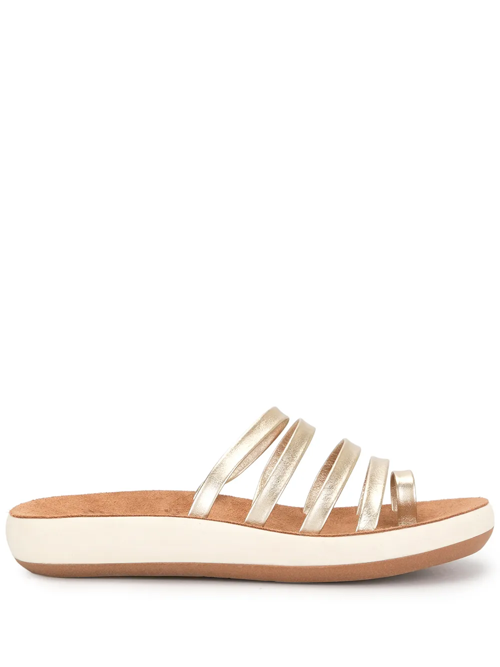Gold-tone leather and rubber Niki metallic sandals from Ancient Greek Sandals featuring a metallic sheen, an open toe and a flat sole. POSITIVELY CONSCIOUS: Ancient Greek Sandals scores 3 out 5 by independent ethical brand rating agency Good On You. It manufactures locally to reduce its carbon footprint, uses low impact non-toxic dyes and visits suppliers regularly in its supply chain.