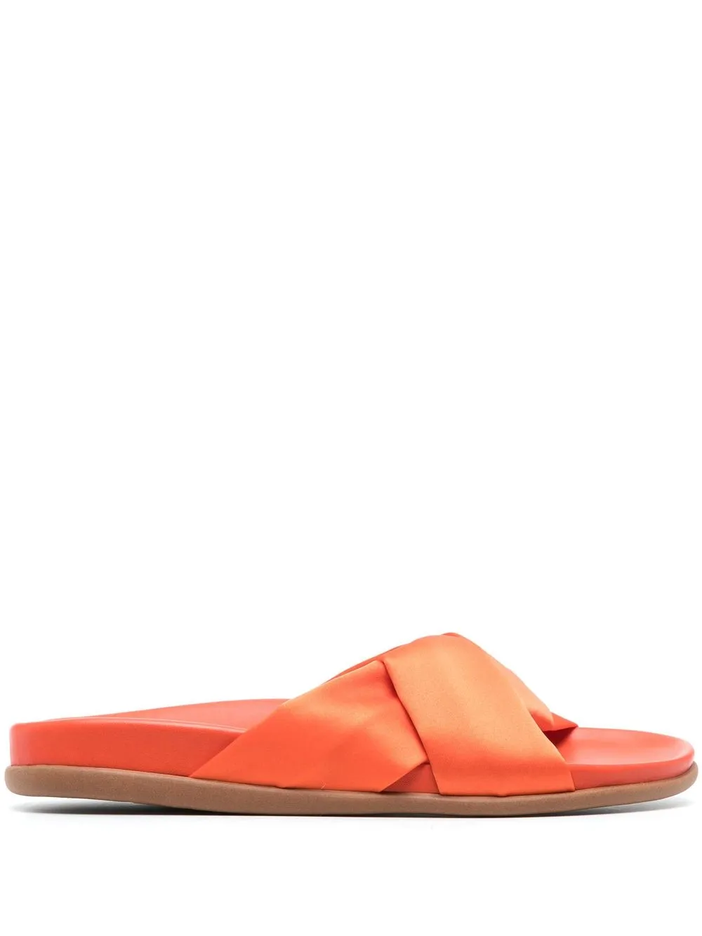 open-toe slip-on sandals from ANCIENT GREEK SANDALS featuring sunset orange, calf leather, satin trim, open toe, flat rubber sole and slip-on style. Conscious: We’ve partnered with Good On You – an ethical agency that rates how sustainably brands perform. This item comes from a brand that performs well in relation to their impact on people, which ensures good working conditions in the supply chain..