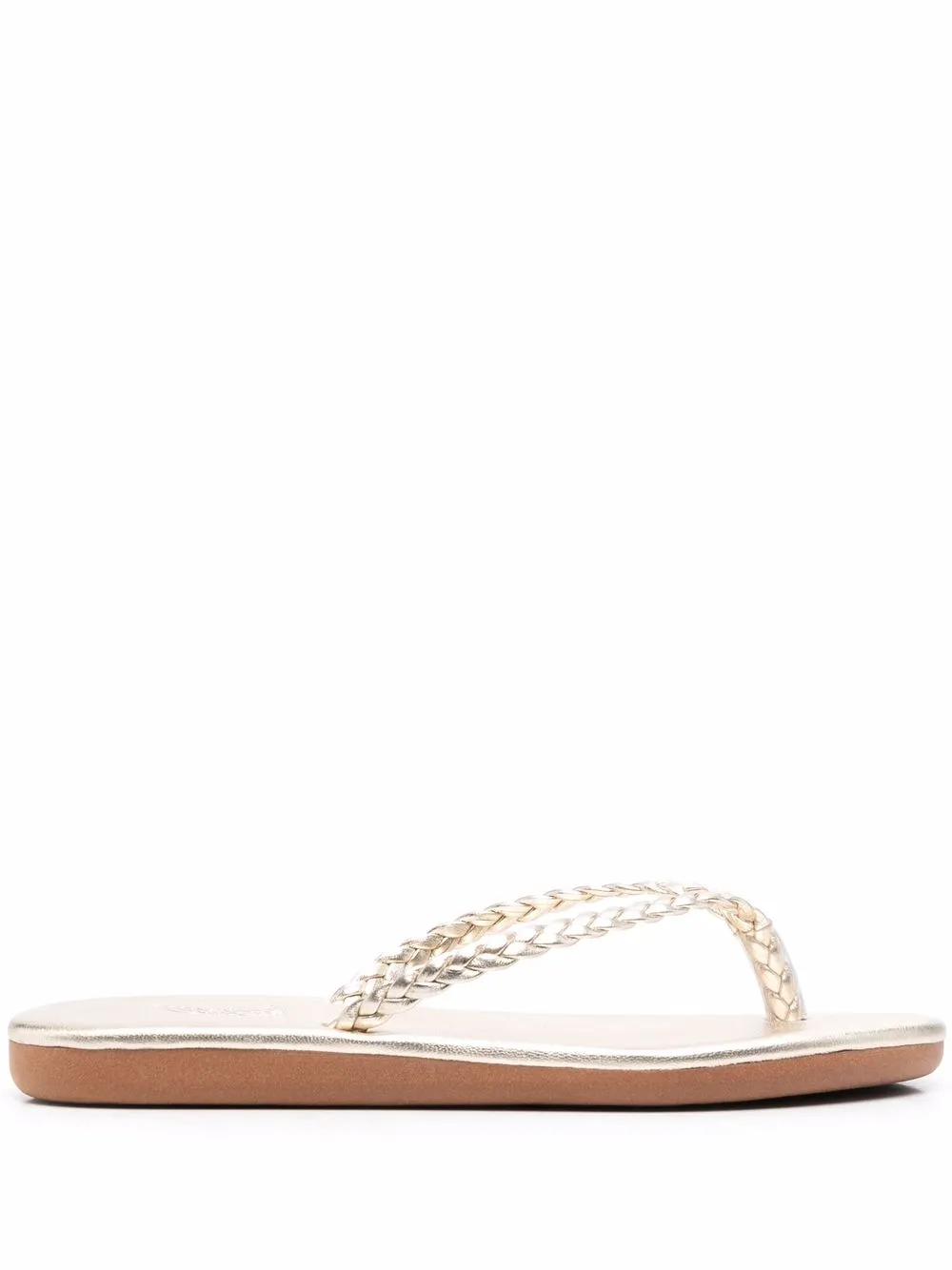 Platinum leather Plage braided-strap flip-flops from ANCIENT GREEK SANDALS featuring thong style, round toe, branded insole, flat rubber sole and braided strap. POSITIVELY CONSCIOUS: We’ve partnered with Good On You — an ethical agency that rates how sustainably brands perform across various people, planet and animal welfare criteria. This product comes from a Conscious brand that performs well in relation to their impact on people, which ensures good working conditions in the supply chain..