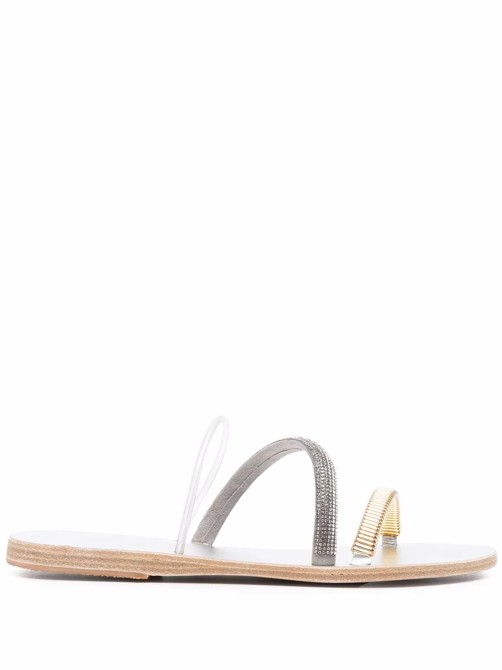 Silver leather Poltimi Sandal Strap from Ancient Greek Sandals featuring crystal embellishment, multi-way strap design and slip-on style. POSITIVELY CONSCIOUS: We’ve partnered with Good On You — an ethical agency that rates how sustainably brands perform across various people, planet and animal welfare criteria. This product comes from a Conscious brand that performs well in relation to their impact on people, which ensures good working conditions in the supply chain..