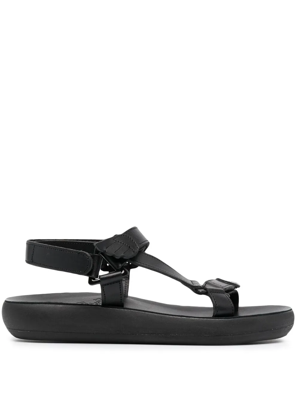 Black leather Poria Comfort sandals from ANCIENT GREEK SANDALS featuring open toe, strap detailing, front touch-strap fastening, ankle touch-strap fastening, branded leather insole and flat rubber sole. POSITIVELY CONSCIOUS: We’ve joined forces with ethical agency Good On You to give you the power to choose positively. This piece is from a brand that scores well on their key criteria..