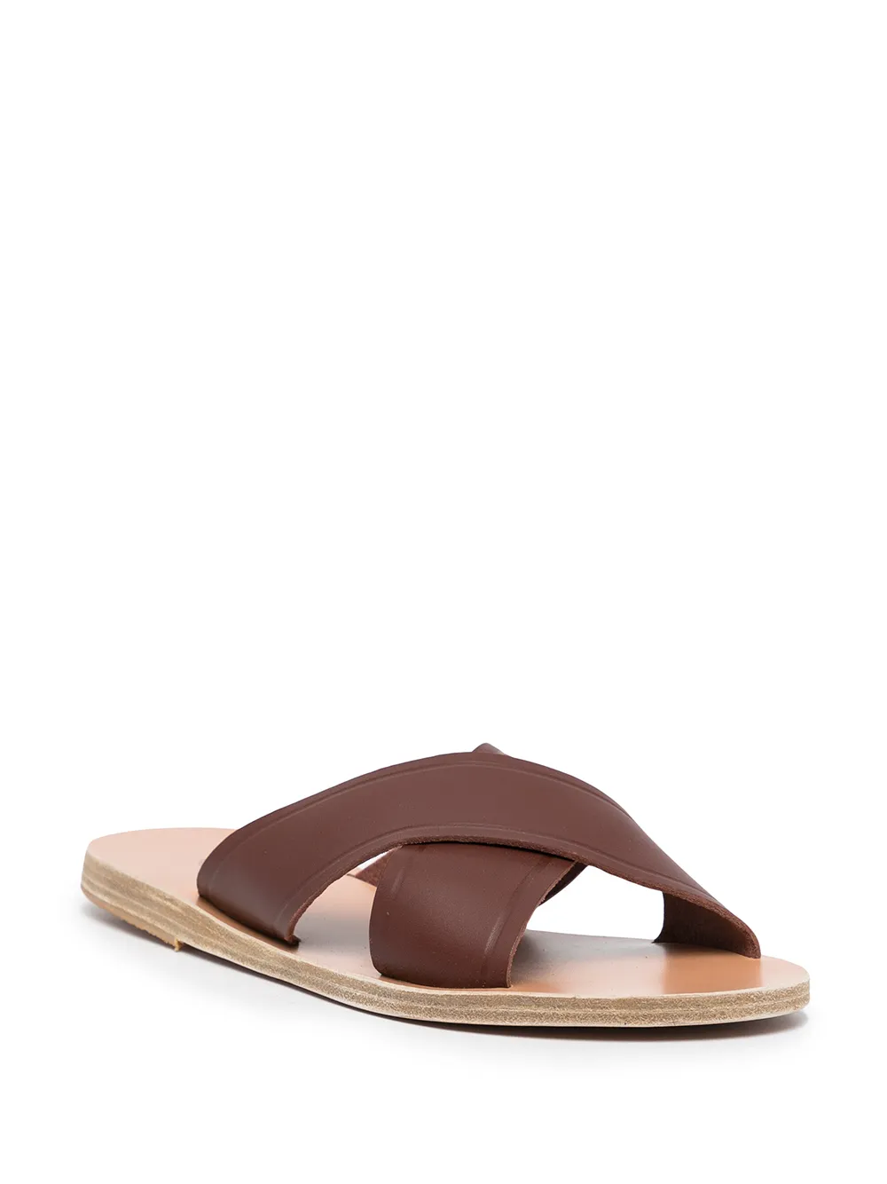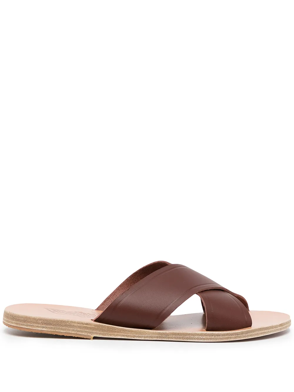 Brown leather Thais crossover-strap sandals from ANCIENT GREEK SANDALS featuring double-strap design, crossover strap detail, open toe, branded insole and flat leather sole. POSITIVELY CONSCIOUS: We’ve partnered with Good On You — an ethical agency that rates how sustainably brands perform across various people, planet and animal welfare criteria. This product comes from a Conscious brand that performs well in relation to their impact on people, which ensures good working conditions in the supply chain..