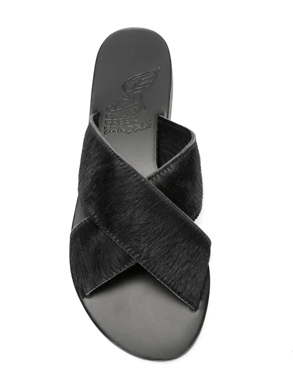 Black leather and calf hair Thais sandals from Ancient Greek Sandals featuring a round toe, crossover straps to the front and a flat sole. POSITIVELY CONSCIOUS: Ancient Greek Sandals scores 3 out 5 by independent ethical brand rating agency Good On You. It manufactures locally to reduce its carbon footprint, uses low impact non-toxic dyes and visits suppliers regularly in its supply chain..