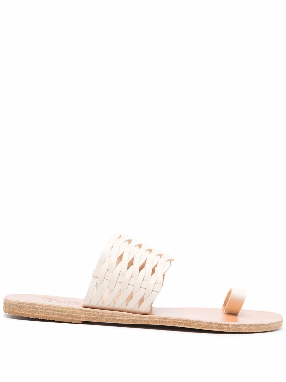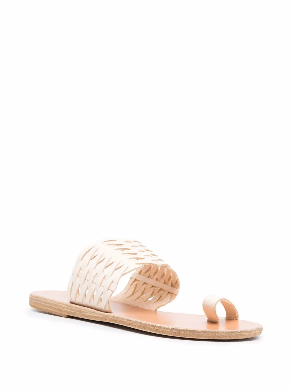 Off-white leather Thalia woven leather sandals from ANCIENT GREEK SANDALS featuring round toe, single toe strap, interwoven design, branded insole and flat sole.