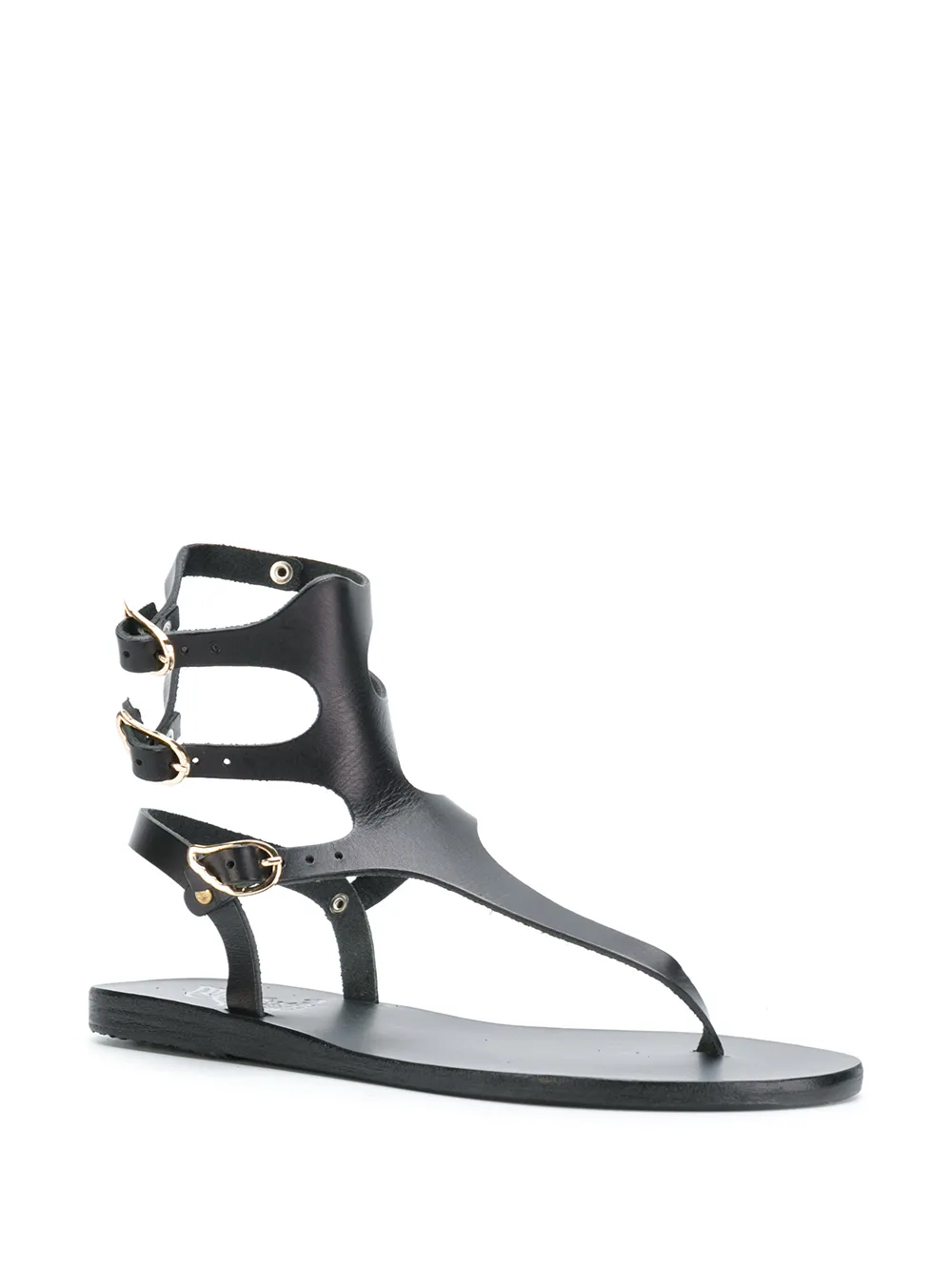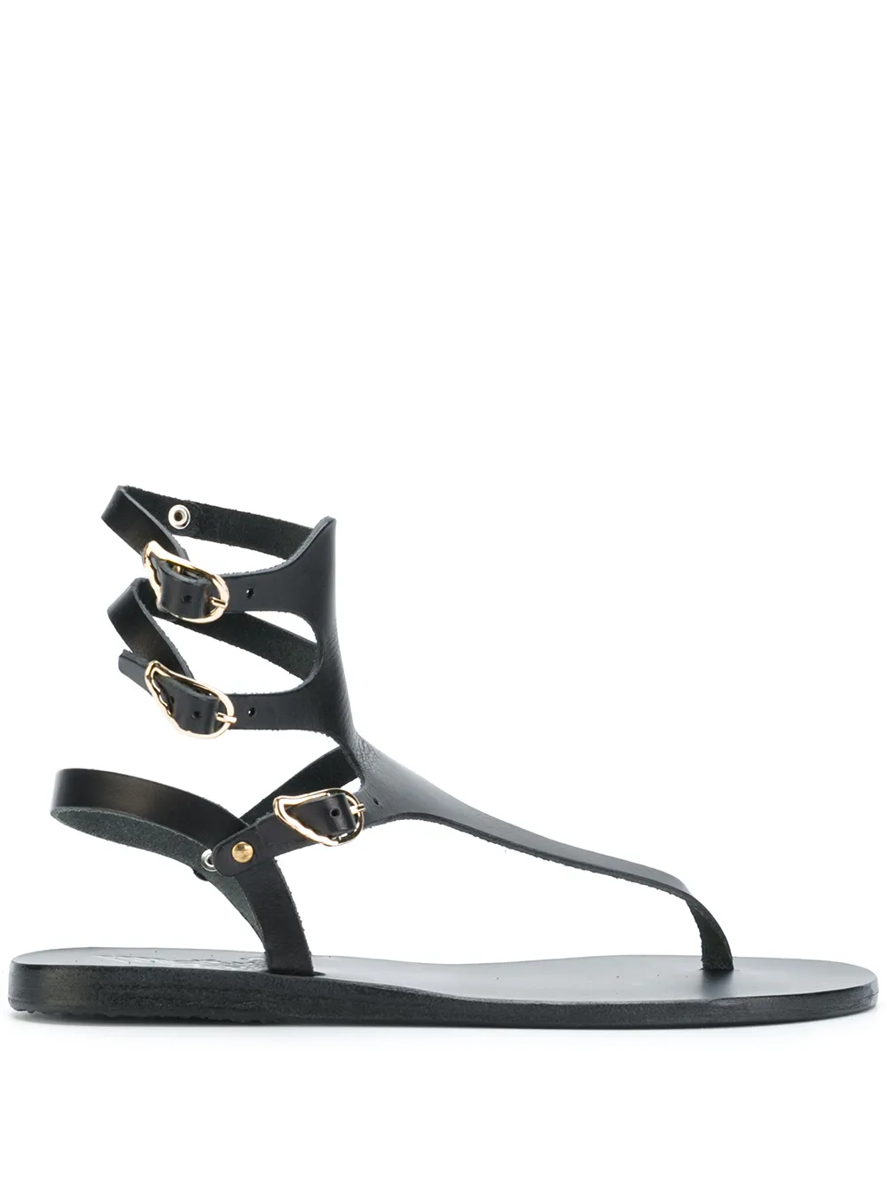 Black leather and bos taurus Themis flat sandals from Ancient Greek Sandals. POSITIVELY CONSCIOUS: Ancient Greek Sandals scores 3 out 5 by independent ethical brand rating agency Good On You. It manufactures locally to reduce its carbon footprint, uses low impact non-toxic dyes and visits suppliers regularly in its supply chain.