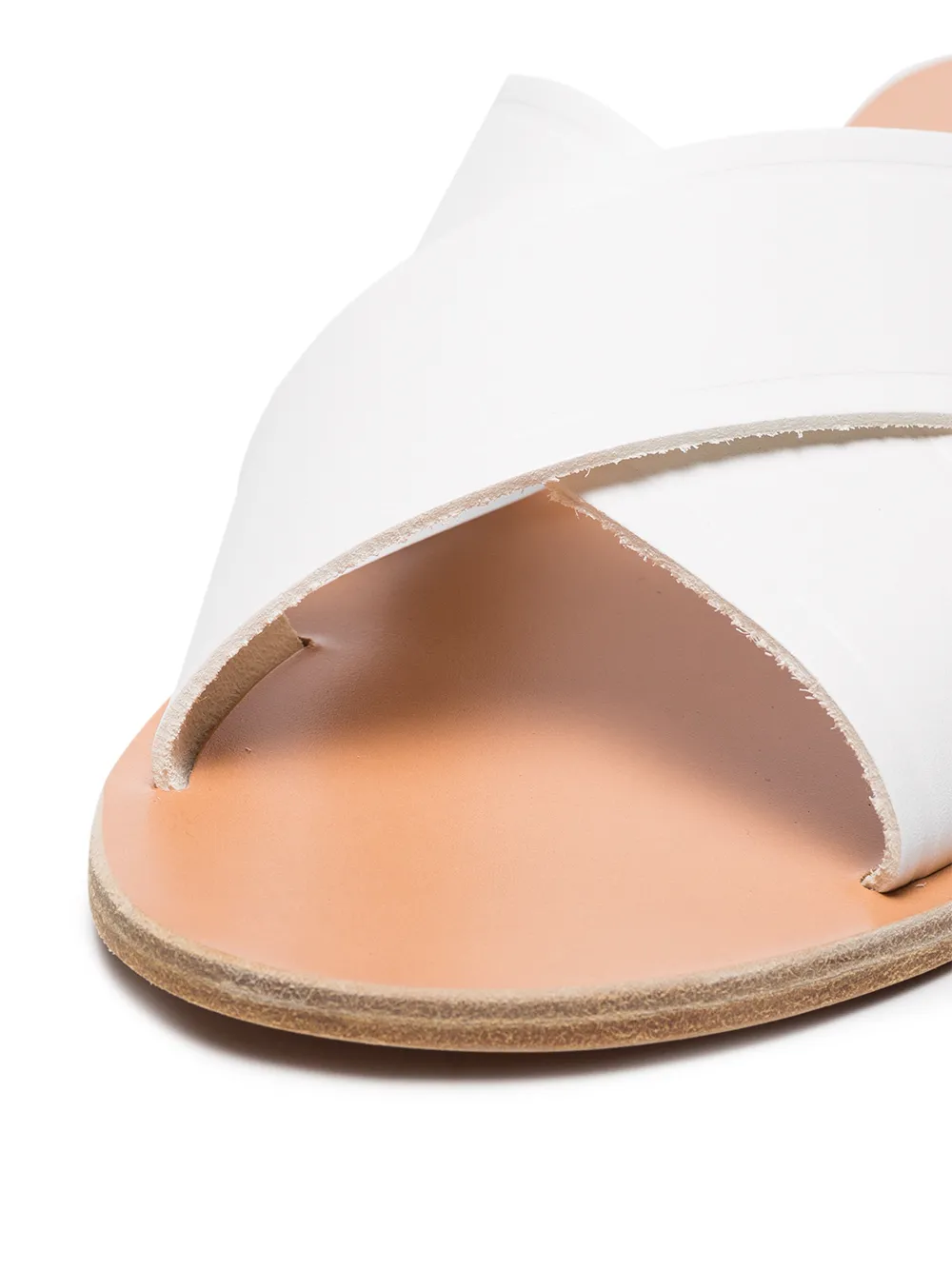 White Thais Leather Sandals from Ancient Greek Sandals featuring an open back, a branded insole, crossover straps to the front and an open toe. POSITIVELY CONSCIOUS: Ancient Greek Sandals scores 3 out 5 by independent ethical brand rating agency Good On You. It manufactures locally to reduce its carbon footprint, uses low impact non-toxic dyes and visits suppliers regularly in its supply chain.