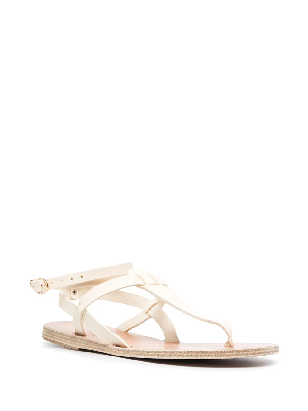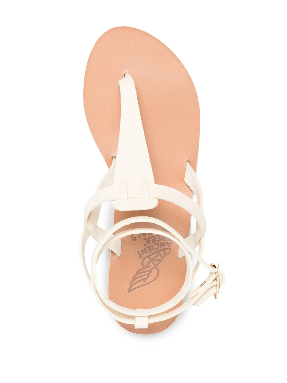White leather wrap ankle sandals from ANCIENT GREEK SANDALS featuring open toe, buckle-fastening ankle strap, branded leather insole and flat sole. POSITIVELY CONSCIOUS: We’ve joined forces with ethical agency Good On You to give you the power to choose positively. This piece is from a brand that scores well on their key criteria..